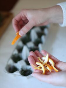 For my orange + evergreen fire starters I used the peel of 1 1/2 to 2 oranges, cut into strips. Fresh or dried both work, and feel free to sub in the peel of lemons, grapefruit, tangerines, or any citrus fruit you have on hand.