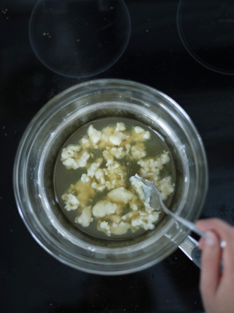 1. Fill pot with hot water to about an inch below where the bottom of double boiler will rest. Place it on the stovetop and turn burner on to medium low heat. Pour beeswax pellets into double boiler or glass bowl and set on top of water pot. Stir every couple of minutes as the wax starts to melt. In 10-15 minutes the wax will be completely melted.