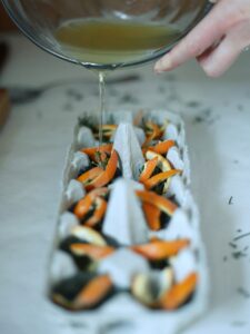 2. While the wax is melting line your workspace (where you’ll be pouring) with baking paper. Gather your orange peel, dryer lint, evergreen clippings, and cardboard egg carton. Place a half-inch sized piece of lint in each cup of the carton. Add a sprig of evergreen to each cup.