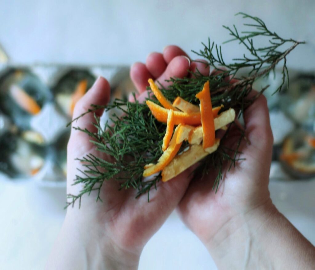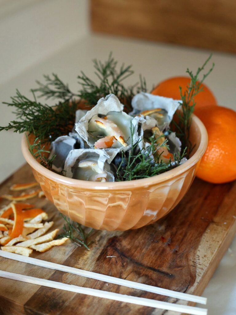 - While the wax is melting line your workspace (where you'll be pouring) with baking paper. Gather your orange peel, dryer lint, evergreen clippings, and cardboard egg carton. Place a half-inch sized piece of lint in each cup of the carton. Add a sprig of evergreen to each cup. Finally, add two pieces of orange peel to each cup, pushing them down slightly to make sure everything will get coated in wax.