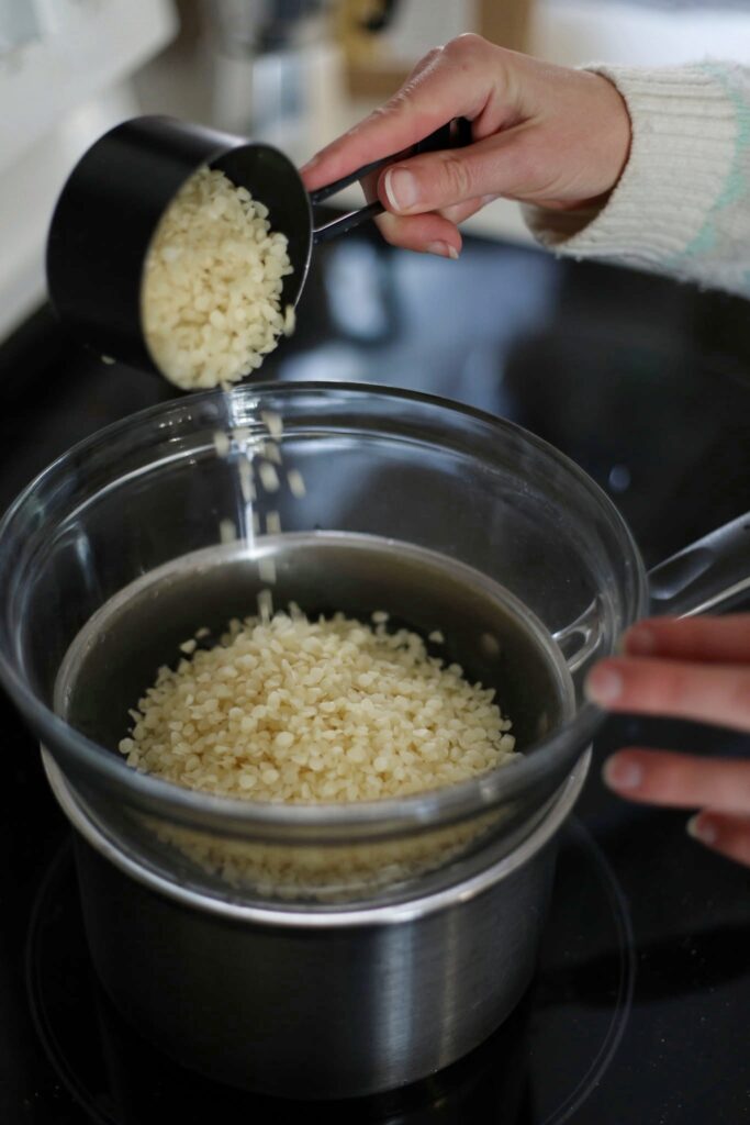 - Fill pot with hot water to about an inch below where the bottom of double boiler will rest. Place it on burner and turn on to medium low heat. Pour beeswax pellets into double boiler or glass bowl and set on top of water pot. Stir every couple of minutes as the wax starts to melt. In 10-15 minutes, the wax will be completely melted.